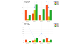 Shows total sales and number of orders from the sample database bound to different axis and also shows how the same chart would appear if bound to the same axis.