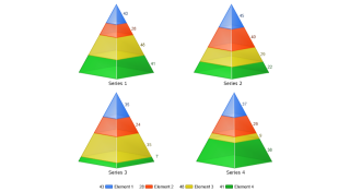 Demonstrates multiple series types in 3D with donut, funnel, pyramid.
