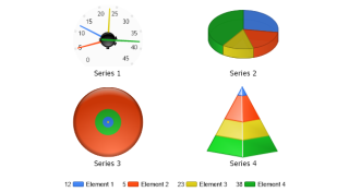 Demonstrates the multiple chart type with pies horizontal linear gauges and bars gauge.