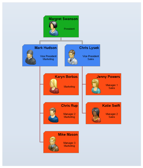 // Demonstrates a manually populated organization chart where the last level is listed vertically due to image size constraints.