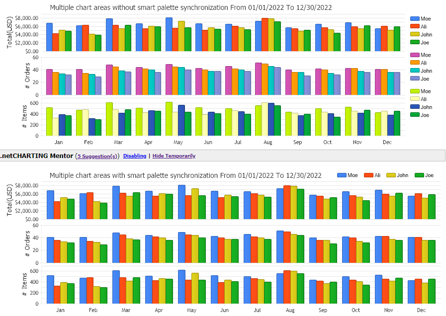Chart.Title="Multiple chart areas without smart palette synchronization"